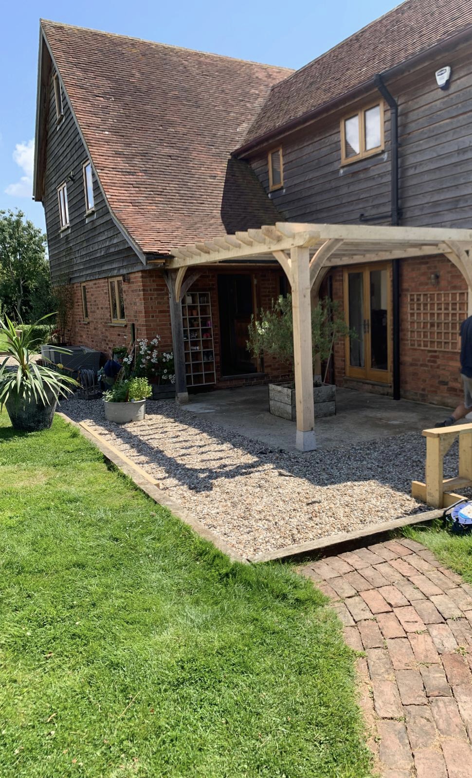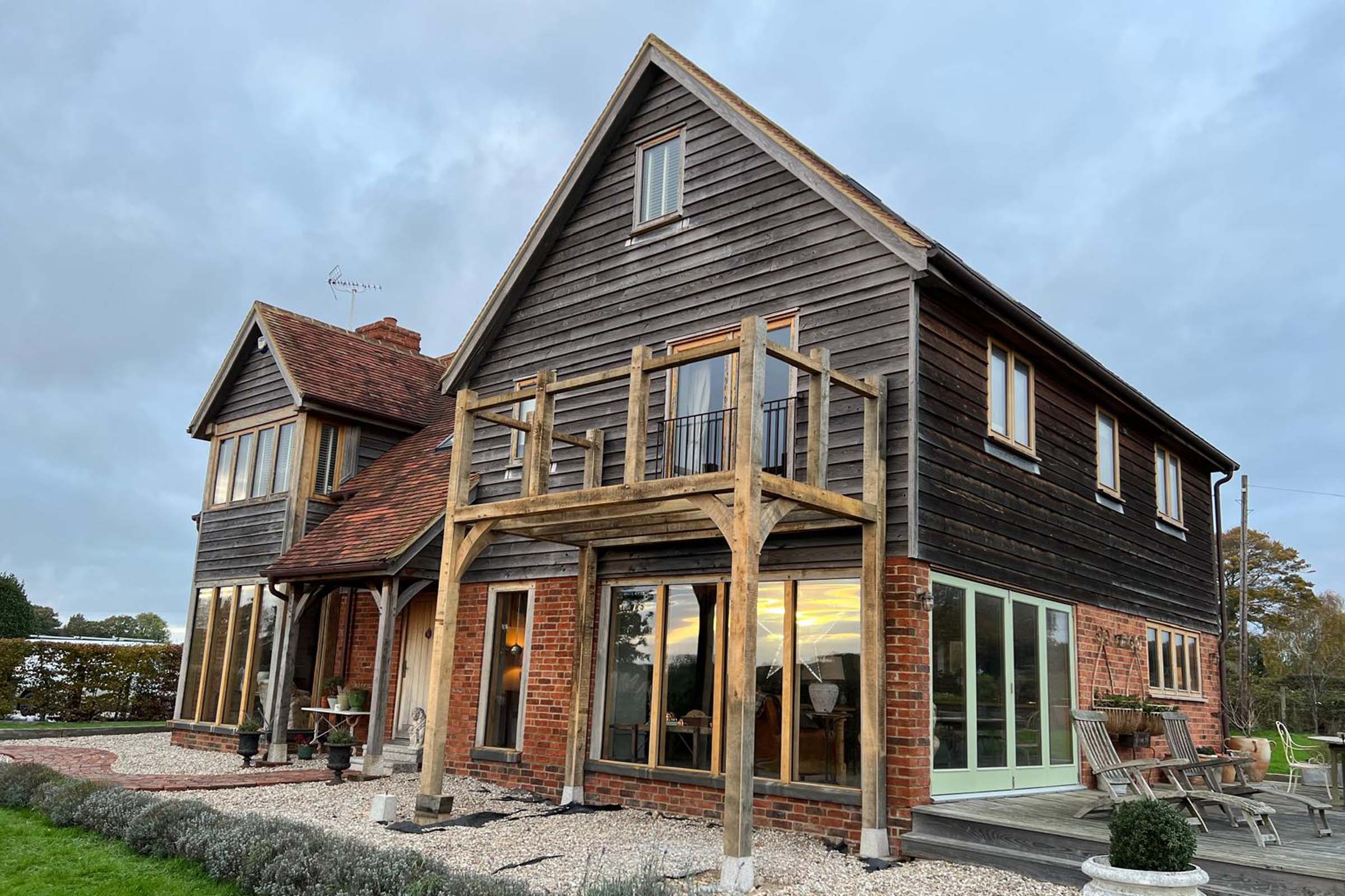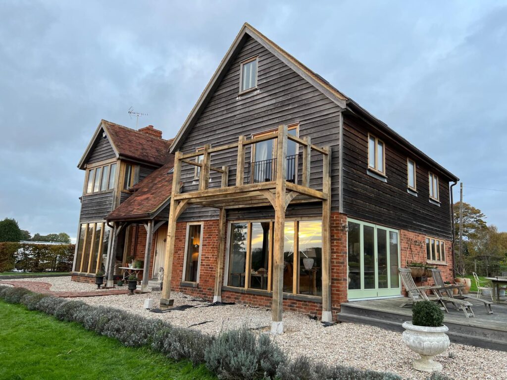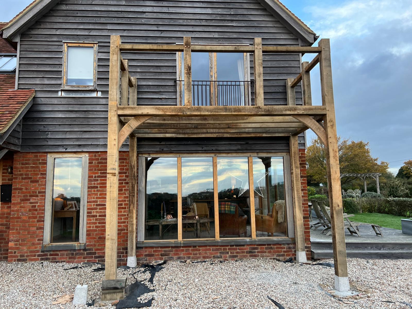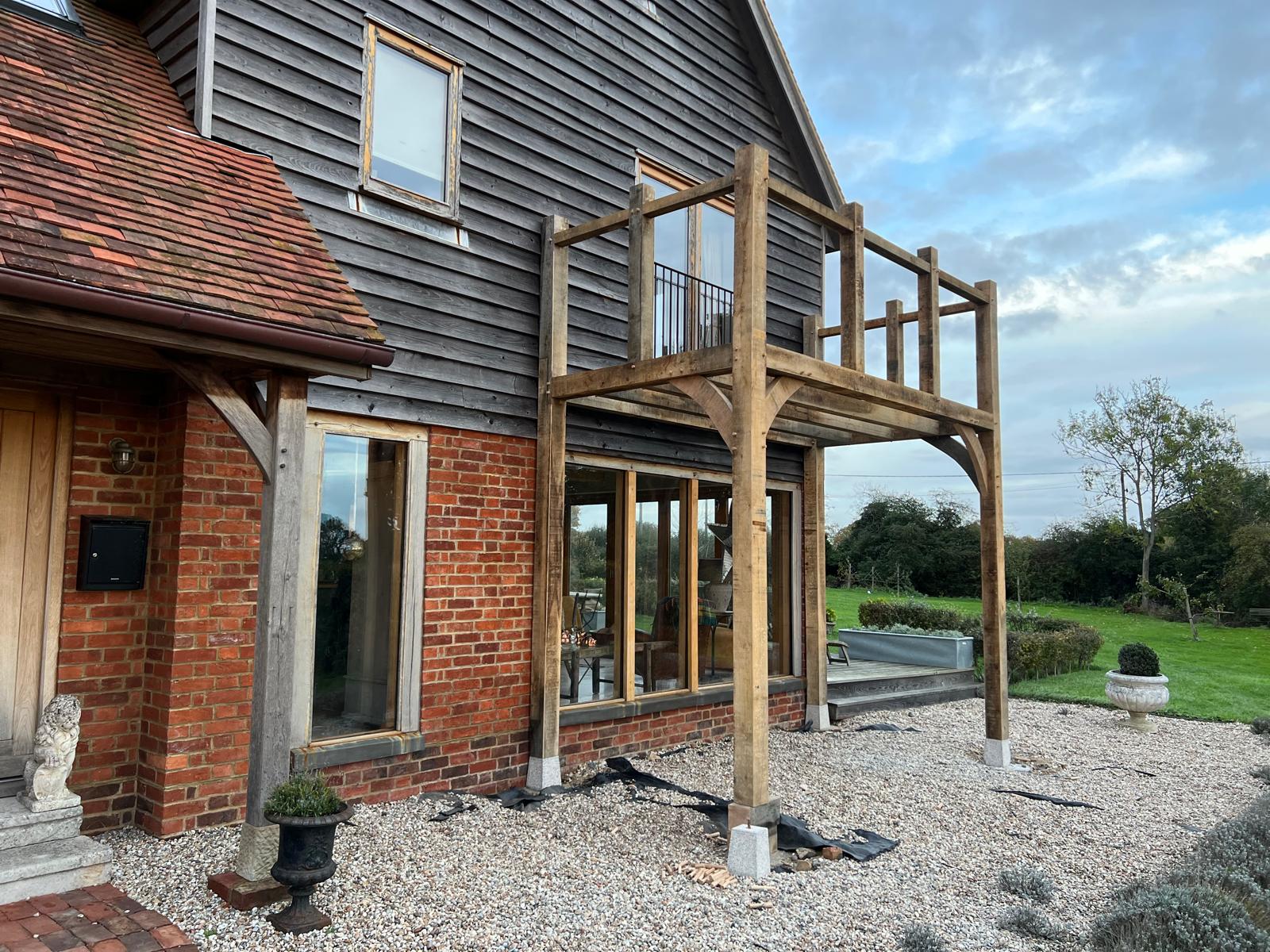 On our first visit to this property, we were asked to build an oak pergola to cover an outside seating area. It gave the area a snug feel whilst still being able to enjoy the outside. We then returned to build an oak framed balcony which was accessed from the master bedroom. It was a great addition to the front of the property and the perfect place to have your morning cup of tea!