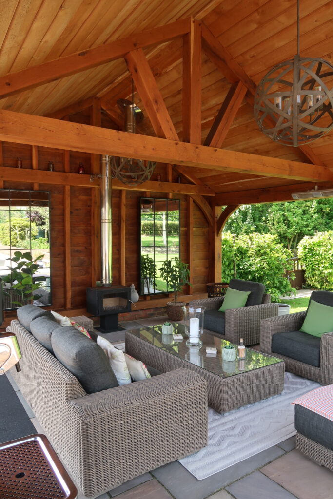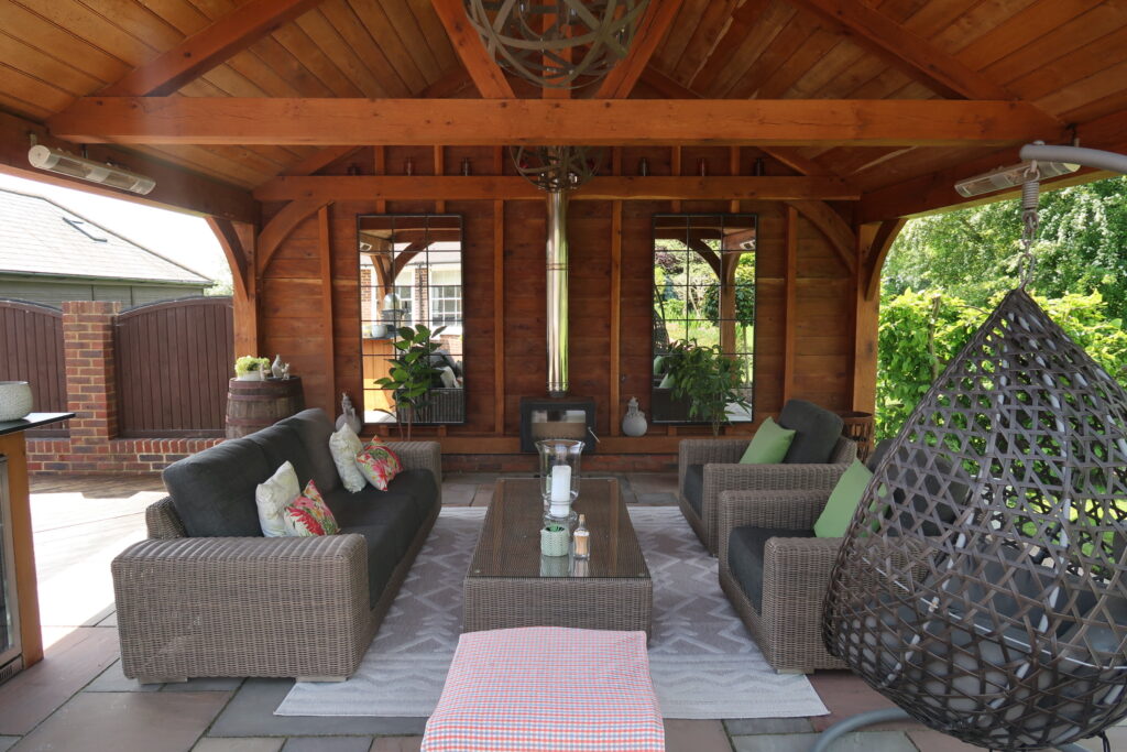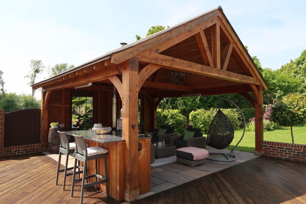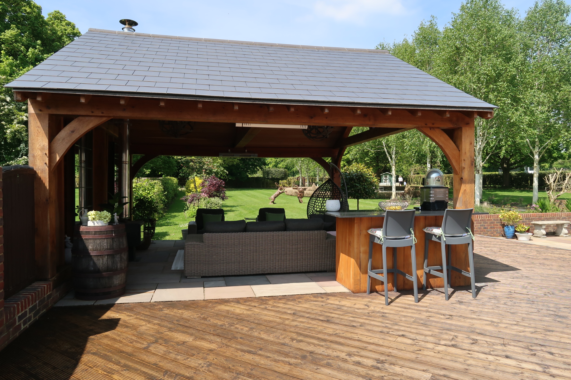 This client had an outside space which needed updating. We ripped out the old decking and fitted an all new substructure and deck which surrounded an open sided oak framed summer house. We fitted oak boards to the top of the rafters to give it the summer house feel. We also built an oak framed bar as a focal point for the space.