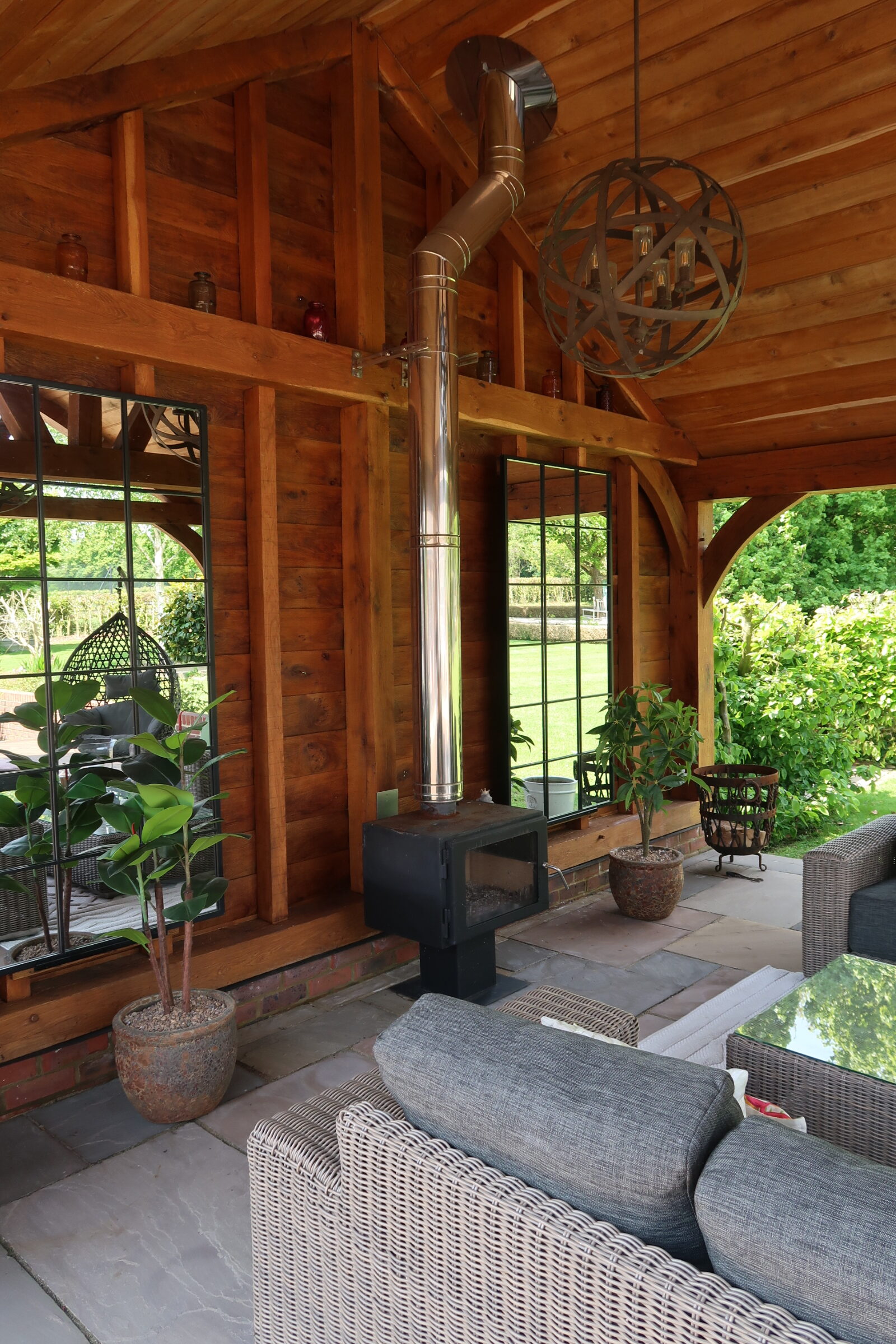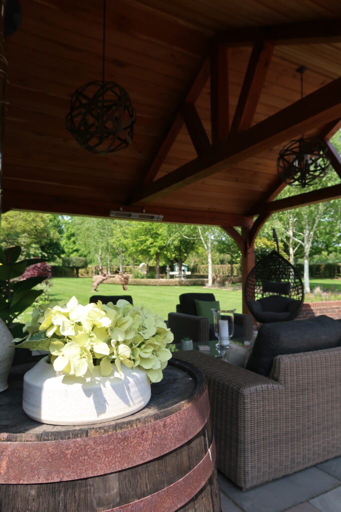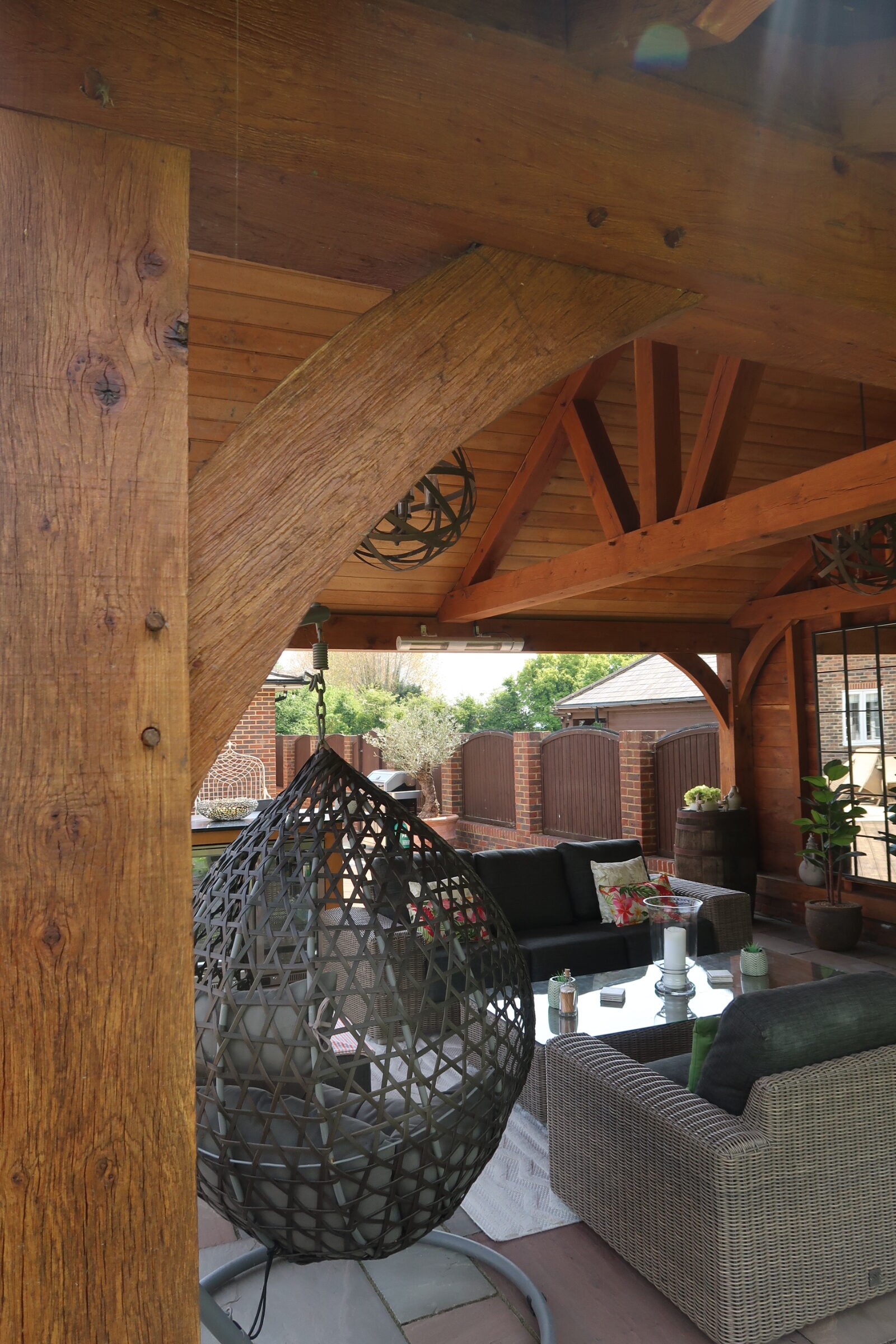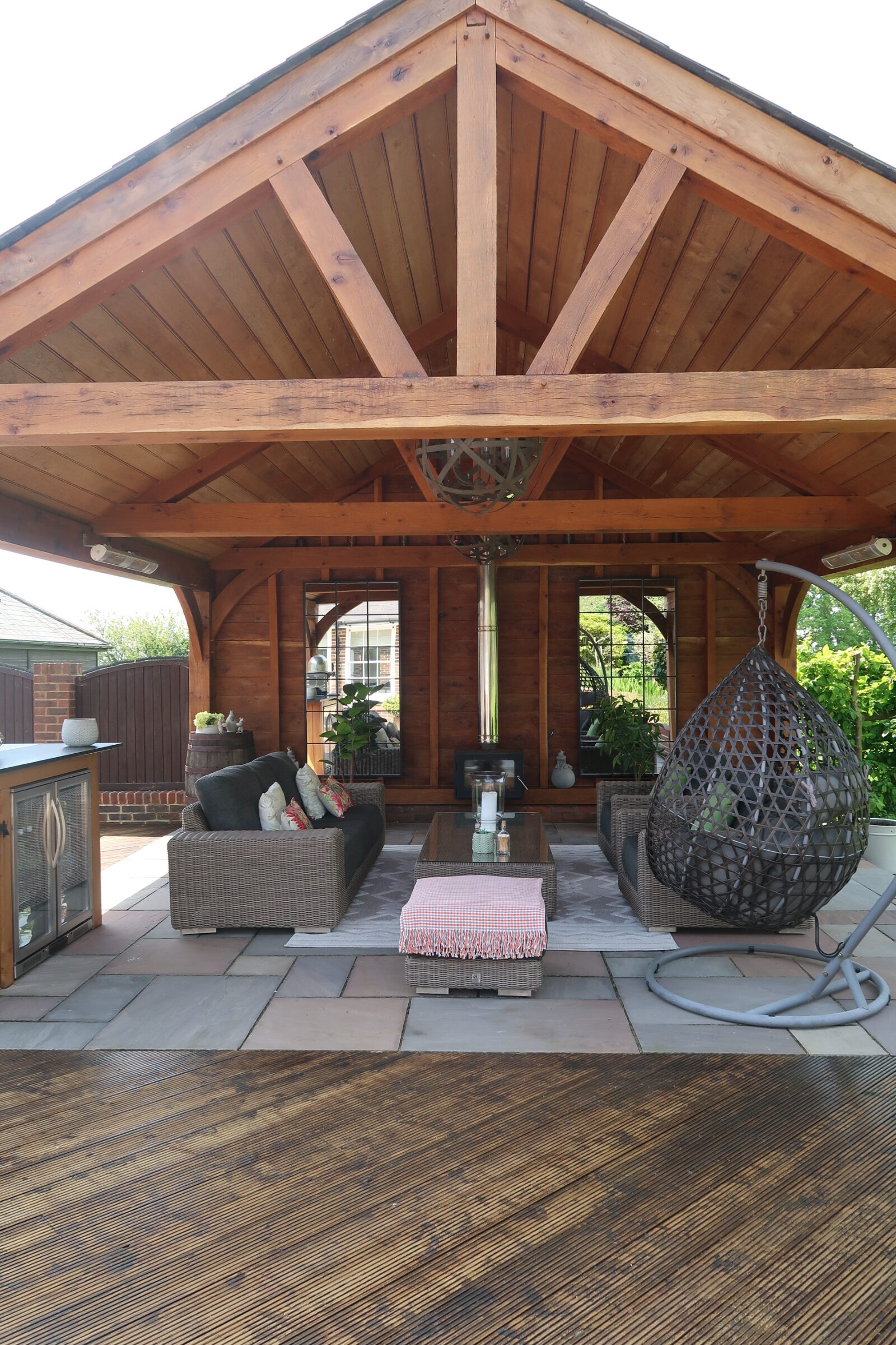 This client had an outside space which needed updating. We ripped out the old decking and fitted an all new substructure and deck which surrounded an open sided oak framed summer house. We fitted oak boards to the top of the rafters to give it the summer house feel. We also built an oak framed bar as a focal point for the space.
